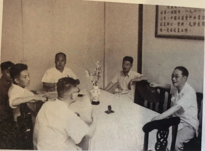 资料图片:20世纪50年代初期,陈毅(右三)、陈丕显(左二)、潘汉年(右一)、王尧山(右二)等上海市领导寻访老渔阳里2号。