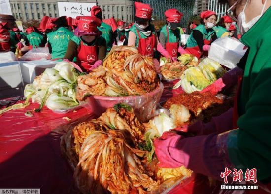 资料图:韩国首尔广场,数千位来自各区政府、企业、民间团体和市民们共同参与首尔越冬泡菜制作活动。