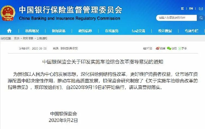 据中国银保监会网站9月3日消息,为贯彻以人民为中心的发展思想,深化供给侧结构性改革,更好维护消费者权益,让市场在资源配置中起决定性作用,推动车险高质量发展,银保监会研究制定了《关于实施车险综合改革的指导意见》,自2020年9月19日起开始施行。