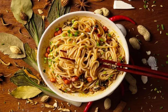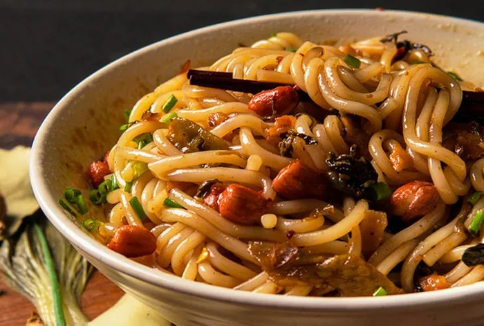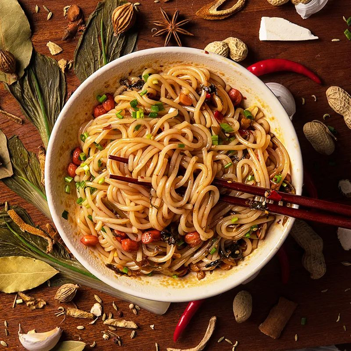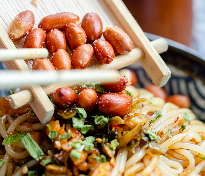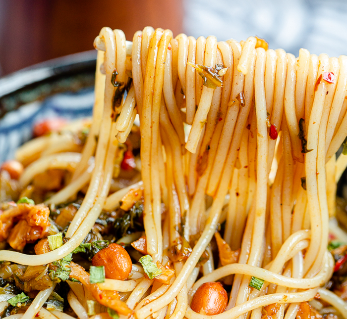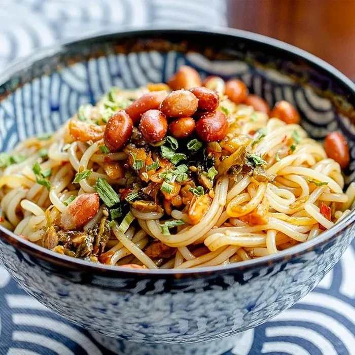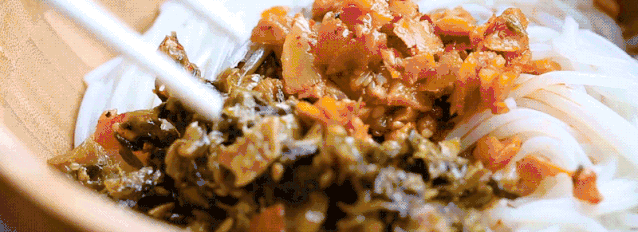 吸溜一大口,Q弹爽滑的米粉,鲜香咸爽的萝卜干和外婆菜嚼的嘎嘣嘎嘣直响,再加上脆香的炸花生,酱汁裹着米粉在唇齿间跳跃。