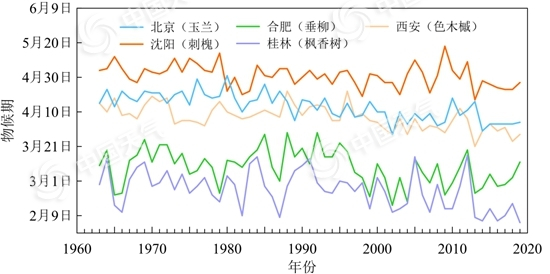 2019年春天,广西桂林的枫香树早早地萌发出了第一片树叶,这个时间比往年提前了20天,是1963年有观测记录以来最早的一次。不仅仅是桂林的枫香树,1963~2019年,中国不同地区代表性植物春季物候期均呈显著的提前趋势,北京站玉兰、沈阳站刺槐、合肥站垂柳和西安站色木槭展叶期始期平均每10年分别提前3.3天、1.4天、2.2天和2.5天。