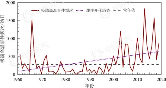 1961~2019年中国极端高温事件频次变化