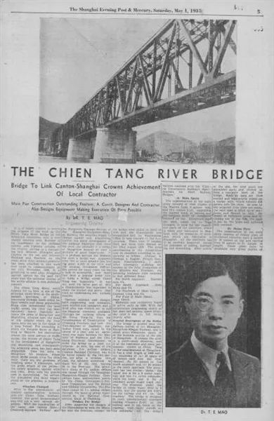 1937年5月1日,茅以升发表在《大美晚报》(The Shanghai Evening Post & Mercury)上介绍钱塘江大桥的文章。