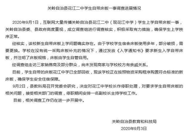 9月2日,网友爆料称,贵州安顺关岭自治县花江二中(现花江中学)要求学生开学自带床板,事情曝光后引起热烈讨论。针对此事,当地发表官方通报称,学校因宿舍部分床板破损未采购,便要求新生自带,校方现已回收;未发现校方和商家有亲戚关系;校长停职。