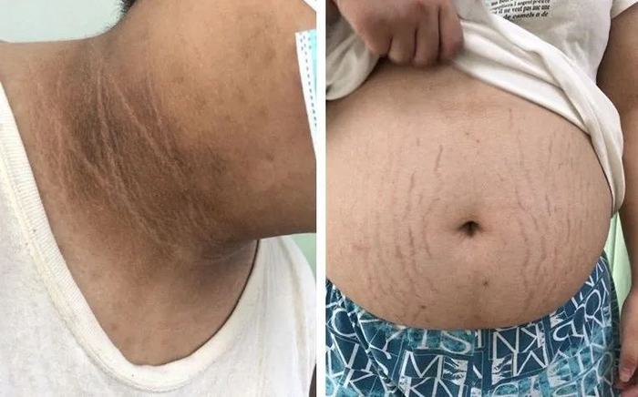 △小明(化名)颈部出现黑棘皮,腹部有紫纹