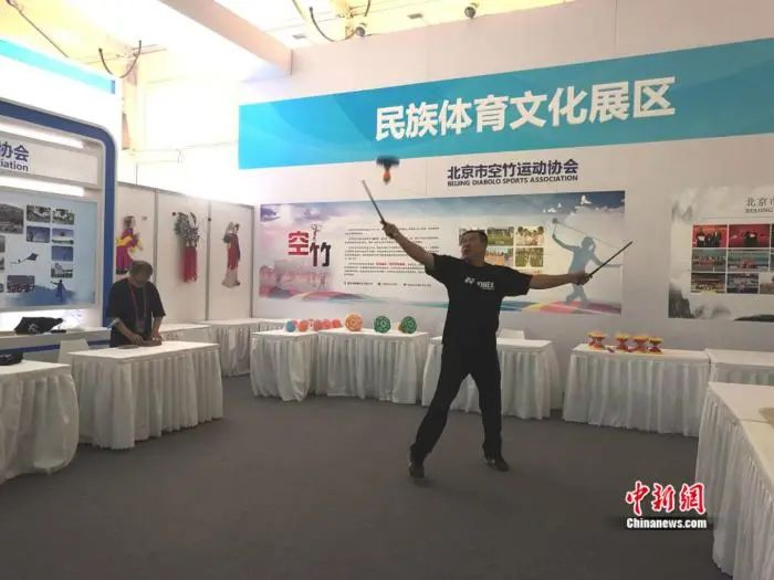 在民族体育文化展区,现场的工作人员正在展示抖空竹,不少探馆的媒体记者也忍不住上前尝试。