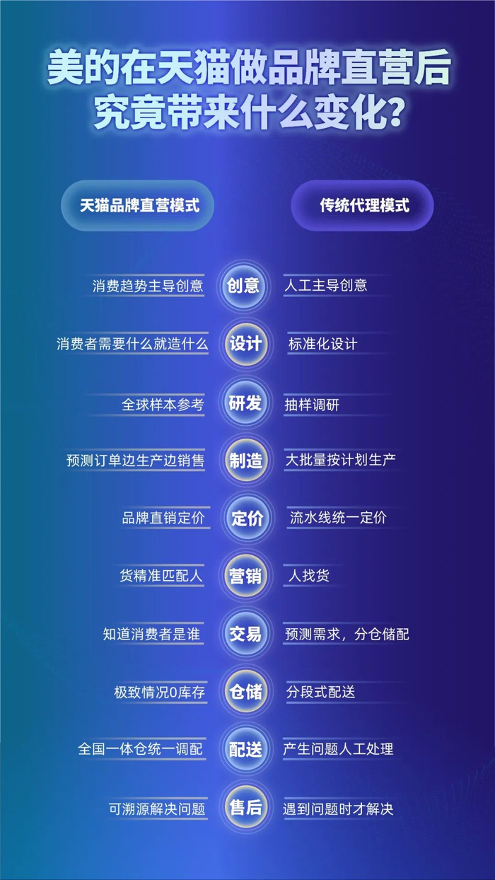 据美的内部人士透露,在销售端,天猫直营模式帮助美的实现“全网一盘货”模式,美的全网统筹货品调度,取消经销仓、分销仓,从品牌直营仓直达消费者,实现最短渠道链路,于此带来了几何级的效率和消费者体验提升。