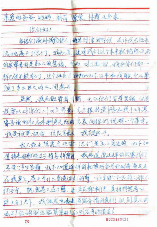 “亲爱的爸爸、妈妈……虽然,我死都背着黑锅,也让你们背着黑锅,但是我要以对你们二十四年养育之恩未报的遗憾和我十几年寒窗苦读的壮志未酬身先死的悲哀向你们说明一个事实:我是被冤枉的,我没有杀人,我不是凶手。”