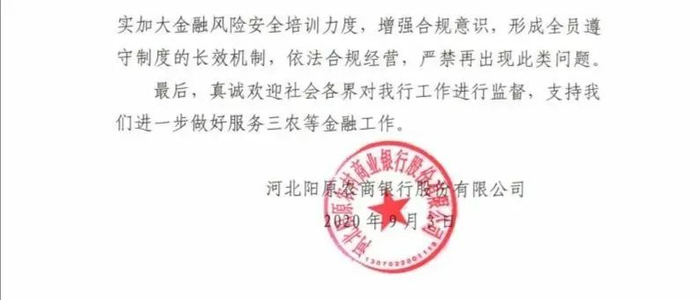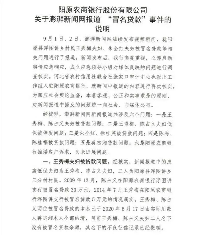 昨天(9月3日),阳原县发布了有关此事的官方回应。回应称,阳原农商银行立即启动舆情应急响应,成立应急领导小组对媒体反映的问题进行调查核实。河北省农村信用社联合社张家口审计中心也派出工作组入驻阳原农商银行,就此事进行再次核实。