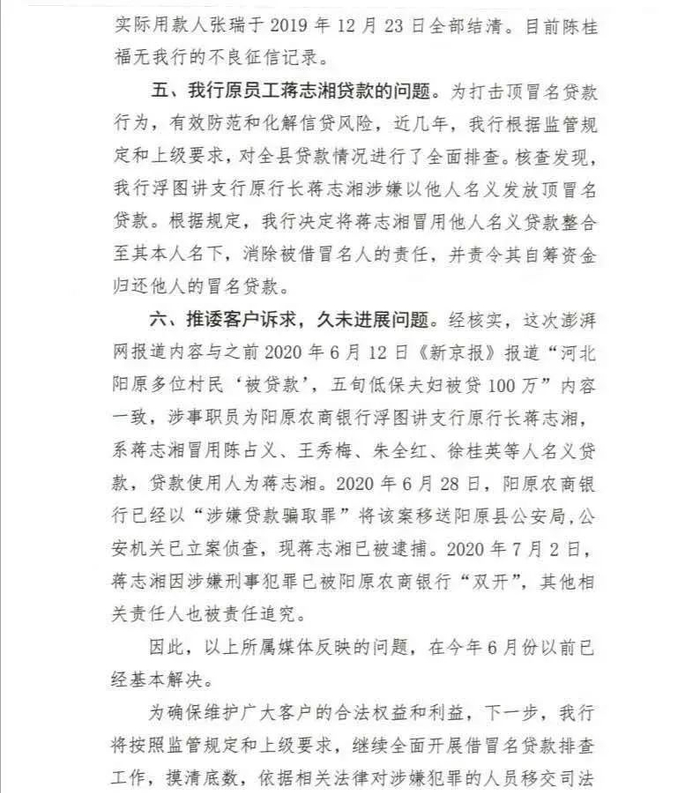 李永刚:2020年6月28日,阳原农商银行已经以涉嫌骗取贷款罪将该案移送给阳原县公安局,公安机关已经立案侦查。现蒋志湘已经被逮捕。2020年7月2日,蒋志湘因涉嫌刑事犯罪已经被阳原县农商银行“双开”,开除党籍和公职,其它相关人员也被责任追究,目前蒋志湘贷款情况正在接受公安机关调查,待公安机关调查完毕,按照公安机关调查结果进行处理。