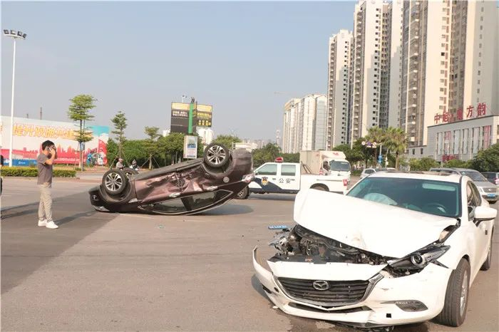 8月31日8点30分,钦州市公安局交警支队一大队民警接到市局“110”指挥中心报警称:在钦州市钦南区南珠东大街和蓬莱大道路口,两辆小车发生碰撞,车辆损坏严重,其中一辆小车发生侧翻。
