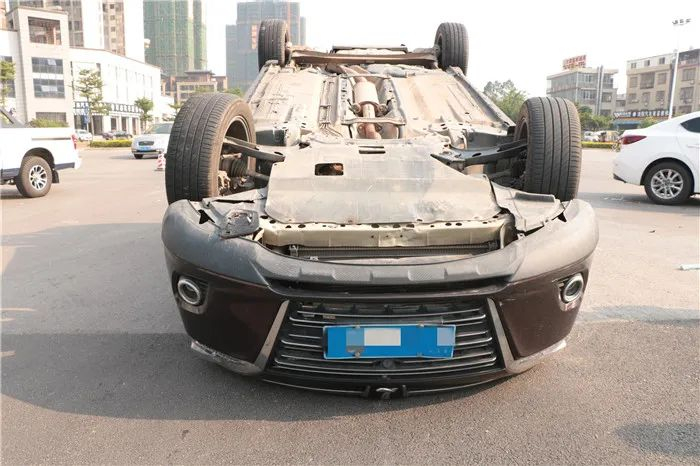 事故导致两车不同程度损坏,其中棕色越野车被撞翻,所幸由于安全带的保护,车内人员并无受伤。