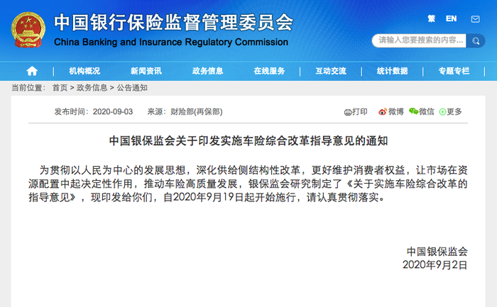 | 银保监会官网发布《关于实施车险综合改革的指导意见》(银保监会官网截图)|