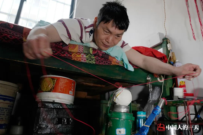 张金莲把要做的棒球引好线,固定在床下,减少丈夫的工作量。