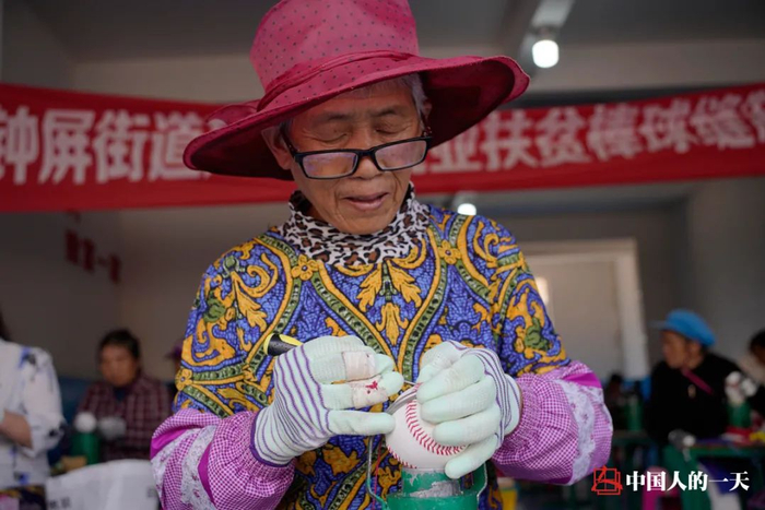 胡先奎的妻子,66岁的唐云芬在做棒球。她说,这比种地要轻松得多。