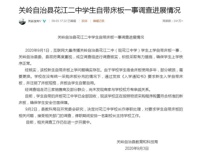 9月2日,县教科局召开党委会研究,决定对花江中学校长作停职处理,对要求学生自带床板的相关问题,接受相关部门的调查,停职期间安排一名副校长主持学校工作。