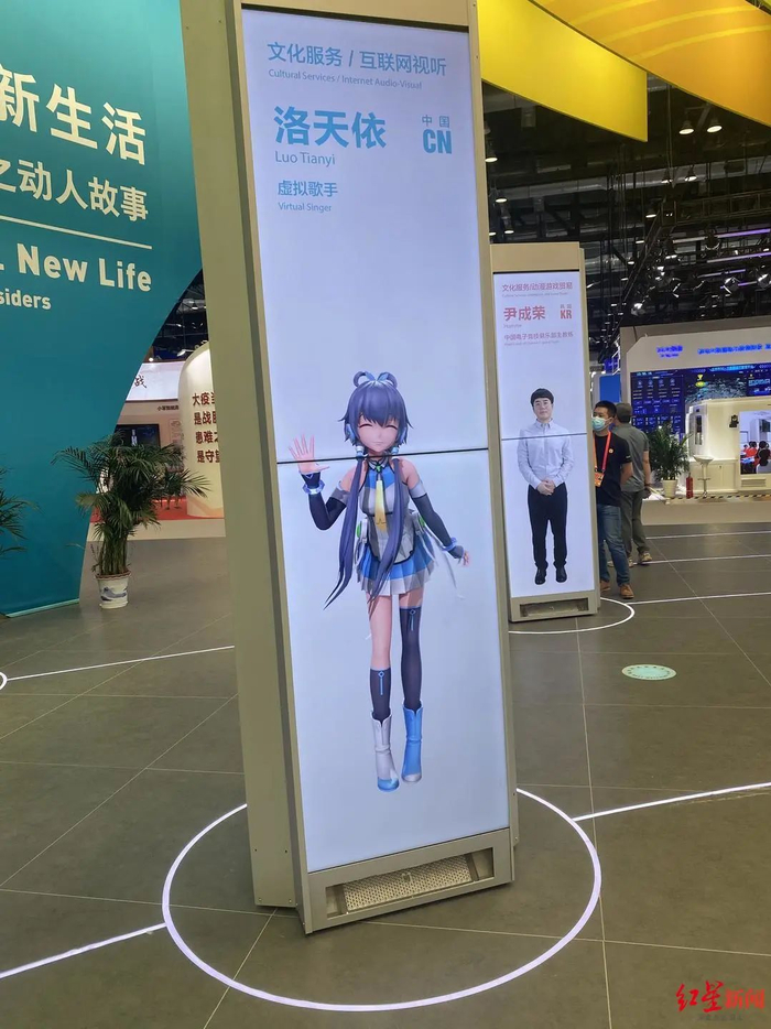 在服贸会的展厅中,洛天依的智能展板上显示着她的职业——虚拟歌手。还有围绕着洛天依的一系列关联词:文化服务、广播影视、互联网视听、语音合成引擎,以及,“短视频出海主力军”……