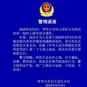内蒙古自治区呼和浩特市公安局玉泉区分局9月5日发布通报称,2020年9月4日,呼市公安局玉泉区分局依法查处一起网上散布谣言案件。