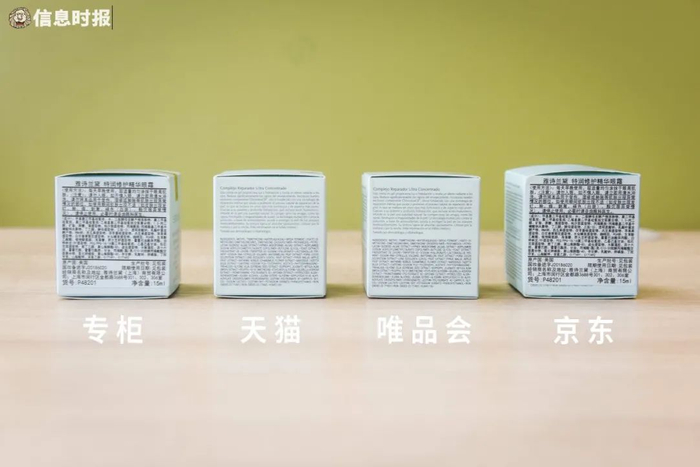抱着“在正规渠道买,踩坑概率怎么也比较小”的心态,记者从天猫、京东、唯品会、专柜四个渠道分别下单了四罐小棕瓶眼霜,进行本次的测评。