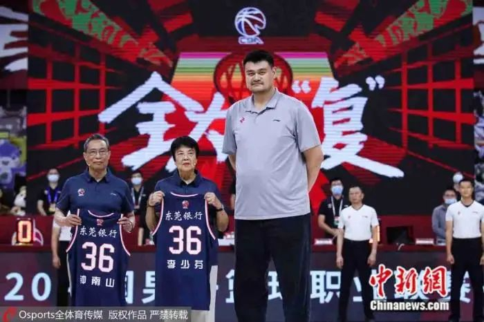 2020年7月3日,2019-2020赛季CBA联赛复赛第一阶段第14日:江苏肯帝亚vs广东宏远,姚明陪同钟南山夫妇亲临CBA东莞赛区,并亲手赠送二老广东宏远队纪念球衣。图片来源:Osports全体育图片社