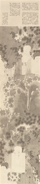 雅集类绘画的另一种呈现形式是卷轴。相比于手卷,其诗文题跋篇幅受限,但这种呈现形式较为庄重,大气,表现雅集的场景一目了然。也是表现雅集场面很好的一种呈现形式。