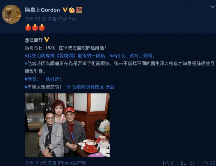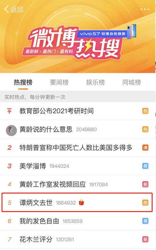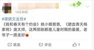 谭炳文去世的消息冲上微博热搜,不少粉丝纷纷发文悼念。