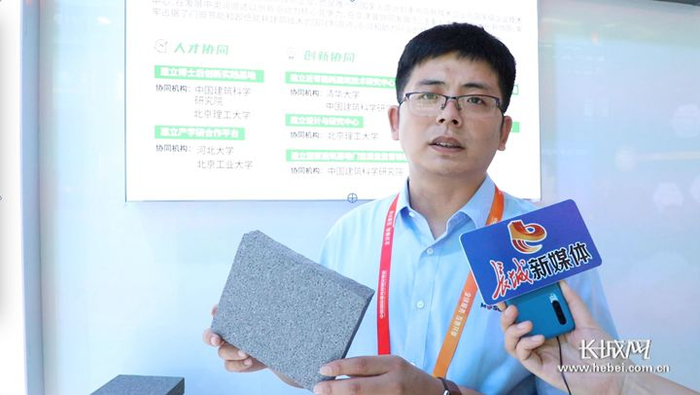奥润顺达集团绿建市场部经理沈丰向参观者介绍产品。长城网记者 胥文燕 摄