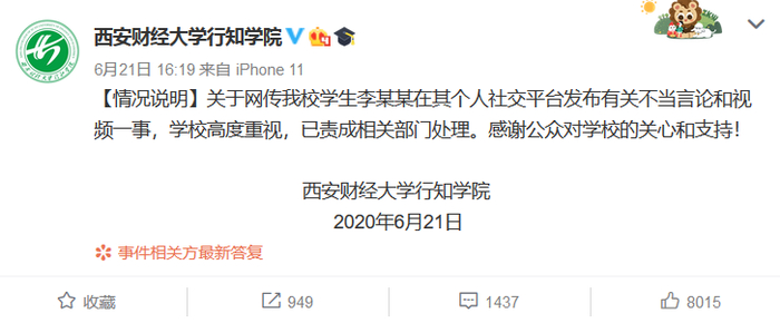 6月21日,@西安财经大学行知学院 发布通报,针对该校学生李某某在社交平台发布不当言论和视频一事,已责成相关部门处理。