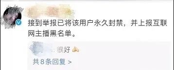 男子被举报后,直播平台官方回复:已将该用户永久封禁,并上报互联网主播黑名单。