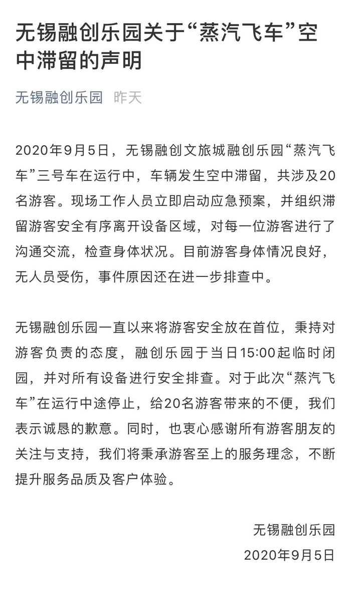 无锡融创乐园一直以来将游客安全放在首位,秉持对游客负责的态度,融创乐园于当日15:00起临时闭园,并对所有设备进行安全排查。对于此次“蒸汽飞车”在运行中途停止,给20名游客带来的不便,我们表示诚恳的歉意。同时,也衷心感谢所有游客朋友的关注与支持,我们将秉承游客至上的服务理念,不断提升服务品质及客户体验。