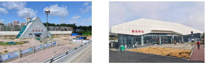 轻轨改造换乘工程于2019年4月开工建设,该站为轻轨3号线与地铁2号线换乘站,位于西解放立交桥西侧,京哈线东侧,新建工程包括地铁2号线换乘通道、提升段、换乘厅,改建工程包括3号线地面厅、轻轨两侧站台过轨通道,扩建工程包括轻轨3号线站台,工程采用明挖法、暗挖法和顶进法施工。