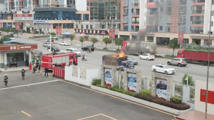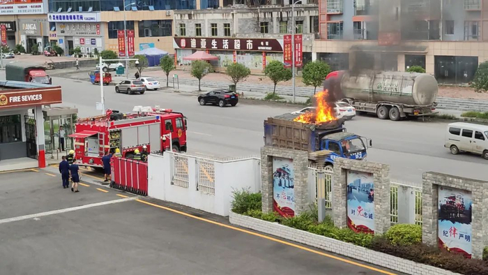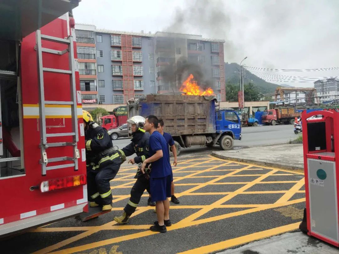 2020年9月5日下午17点10分,一辆运载垃圾的货车突然停在了绥阳县消防救援大队营区门口,司机冲下车向正在站岗的消防员说道:“我车起火了,快帮帮我”。正在站岗的消防员立即通过对讲机将情况向值班指挥员汇报后,值班指挥员立即组织10余名消防员前往救援。