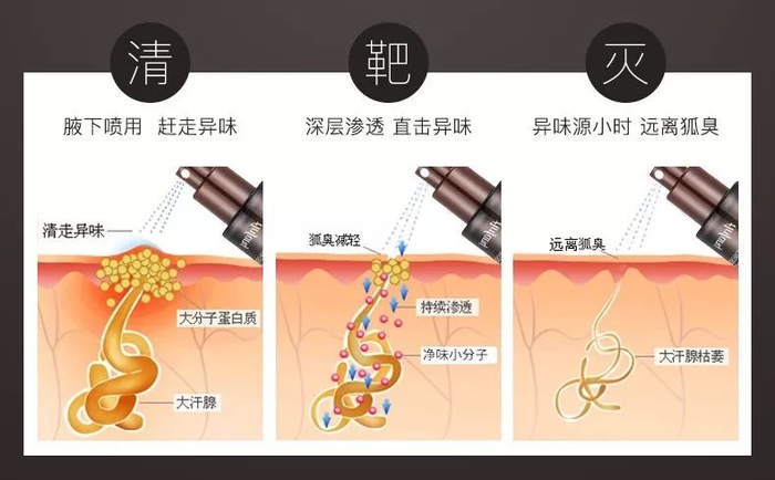 当这几种物质加入狐臭水中时,它们能变身小分子进入皮肤,达到温和的平衡汗腺。