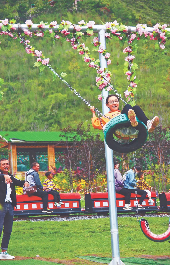 连日来,青海省西宁市大通回族土族自治县朔北藏族乡边麻沟村迎来许多游客。图为日前游客在边麻沟村景区内荡秋千。