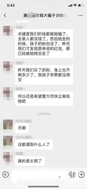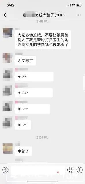 “那天我们去报案,跟馆里的清洁工李姐聊起来。李姐微信上有5800元钱,是留着给姑娘开学做学费的。她居然想方设法,把李姐微信上5800元钱全骗走了,还拖欠了李姐几个月的工资,真是太无耻了!”李女士说:“她把新馆搬到兰陵阁酒店,不但没给老板付房租,还骗了老板的1万元钱!”