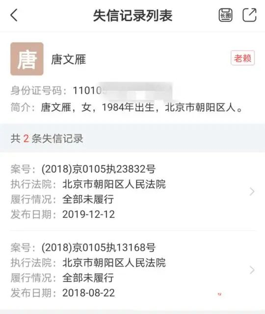 小七告诉记者,在被骗钱后,有人在网络上搜索发现,她的真名叫做‘唐文雁’,生于1984年,系北京宜珍雅集商贸有限公司(宜食一味16家店面所属公司)法人。自2016年1月起陆续向周边熟人、员工,以进货、开店装修、资金周转、员工入股分红等名义短短数月大量借款上千万。在2017年,此人用唐文雁的名字在北京就被朝阳区警方定性为老赖(涉案金额达到3000多万元)。