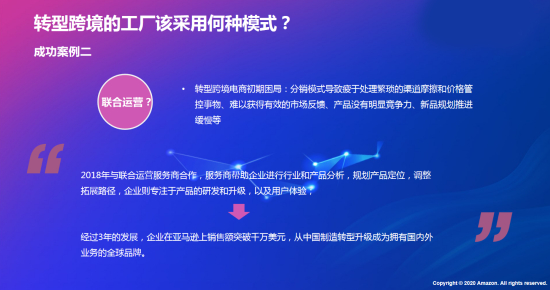 8月12号召开的2020亚马逊全球开店线上直采大会,亚马逊提出了联合运营模式,并且大面积的对中小科创企业进行传播,联合运营平台帮助转型工厂进行渠道破局,从产品分析、规划产品定位、调整拓展,路径,取得了丰厚的成果,企业仅需要专注产品研发,升级和用户体验。经过3年发展,企业在亚马逊上销售额突破千万美元,从中国制造转型为国内外业务的全球品牌。