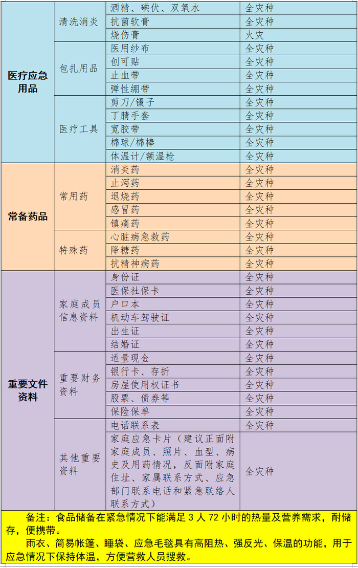 建议清单内都有哪些应急物品?适用于什么灾害类型?一起来看看吧: