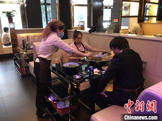 “能吃上火锅真是太好了,疫情期间就很想吃一次,今天终于解馋了”在火锅店就餐的张女士说,火锅打包会影响口感而且在家吃味道大,能够堂食很方便;进店后服务员带着口罩,同时明显可以闻见消毒水的味道,感觉很安心。