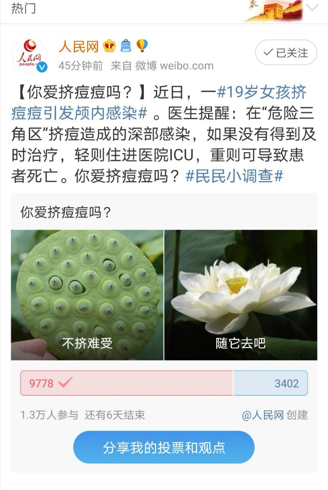 记者注意到,在这三个方面中,网友参与度最高的当属“手不听使唤”,而在人民网发起的“你爱挤痘痘吗”的调查中,选择“不挤难受”的网友是“随他去吧”的3倍。由此可见,广大网友对“挤痘痘”危险性的认识程度并不高。