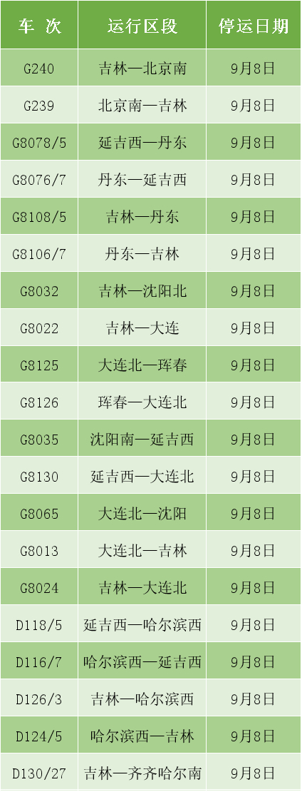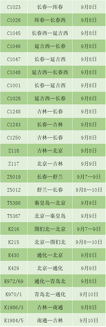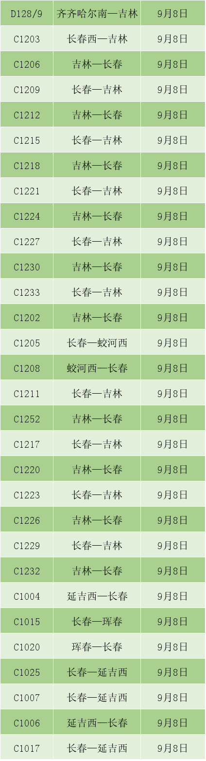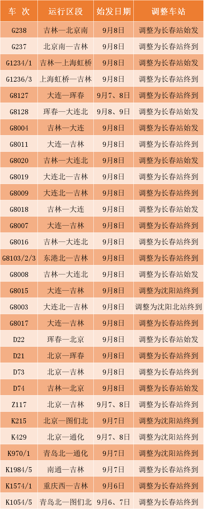 受台风“海神”影响,长春站、长春西站以下列车停运:9月7日-9日长春-舒兰Z5019次、9月7日-8日长春-吉林C1233次、9月8日长春西-吉林C1203次、9月8日长春-吉林C1209次、9月8日长春-吉林C1215次、9月8日长春-吉林C1221次、9月8日长春-吉林C1227次、9月8日长春-蛟河西C1205次、9月8日长春-吉林C1211次、9月8日长春-吉林C1217次、9月8日长春-吉林C1223次、9月8日长春-吉林C1229次、9月8日-9日图们北-青岛北K1056次、9月8日吉林-南通K1986次、9月8日吉林-重庆西K1572次、9月8日吉林-北京Z118次、9月10日北京-吉林Z117次、9月10日-11日青岛北-图们北K1055次、9月11日南通-吉林K1985次、9月12日重庆西-吉林K1571次列车停运。长春站以下列车变更到发站:9月7日-8日大连-珲春G8127次变更为长春终到;9月7日-8日青岛北-图们北K1055次变更为长春终到;9月8日-9日珲春-大连G8128次变更为长春始发;9月8日南通-吉林K1985次变更为长春终到;9月8日重庆西-吉林K1571次变更为长春终到;9月8日-9日北京-吉林Z117次变更为长春终到。长春站提醒广大旅客,有关列车停运及正晚点动态,请密切关注车站公告、中国铁路12306网站。已购买停运列车车票并换取报销凭证的旅客,可于票面乘车日期起30日内(含当日)持车票到车站窗口办理退票或改签;在12306网站购买车票、未换取报销凭证的旅客,可在网站、12306手机客户端直接办理退票或改签,均不收取手续费。如有变化,请以铁路12306网站公布为准。受台风“海神”影响