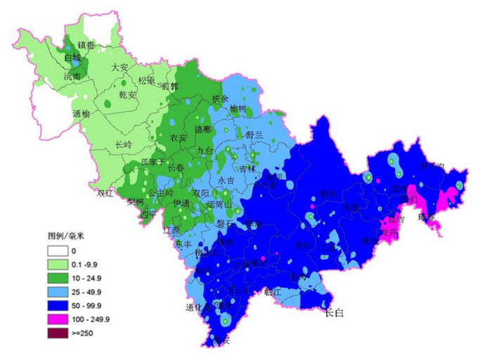截至8日05时,全省平均降水量37.5毫米,地区分布:延边79.9毫米,白山65.1毫米,长白山保护区57毫米,通化54.6毫米,吉林37毫米,辽源23.1毫米,长春21毫米,四平14.7毫米,松原8.4毫米,白城3.1毫米。