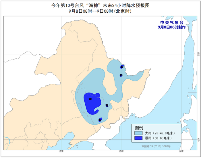 预计,9月8日08时至9日08时,辽宁东北部、吉林中西部、黑龙江西南部和中北部等地有大到暴雨(50~80毫米)。此外,福建东北部和南部、广东东部沿海和广西南部沿海等地局地有大雨或暴雨(50~70毫米),最大小时降雨量20~40毫米,局地可达60毫米。