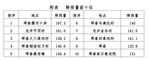 过程降雨量超过100毫米的44站,50.0~99.9毫米的419站,25.0~49.9毫米的324站,10.0~24.9毫米的346站。最大过程降雨量珲春圈河口岸167.3毫米,最大小时雨强珲春防川村27毫米。