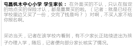 对于家长反映的事情,学校应该第一时间去做调查,给有疑惑的家长一个答复,可家长一反映,媒体一采访,学校不是先调查买保险的事,反而是开始调查家长,调查是谁向媒体反映了此事!