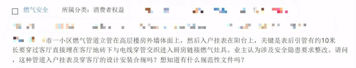 某市一小区燃气管道立管在高层楼房外墙体面上,然后入户挂表在阳台上,关键是表后引管有约10米长,要穿过客厅直接埋在客厅地砖下,与电线穿管交织,进入厨房连接燃气灶具。业主认为涉及安全隐患要求整改。请问,这种管道入户挂表及穿客厅的设计安装合规吗?想知道有什么规范性文件吗?