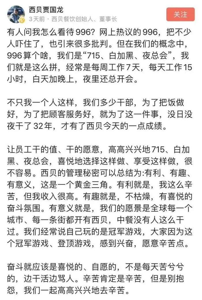 早在今年3月份,网上就流传着贾国龙谈及996和“715工作制”的视频。他说“715工作制”在西贝内部已经讲了十几年了。