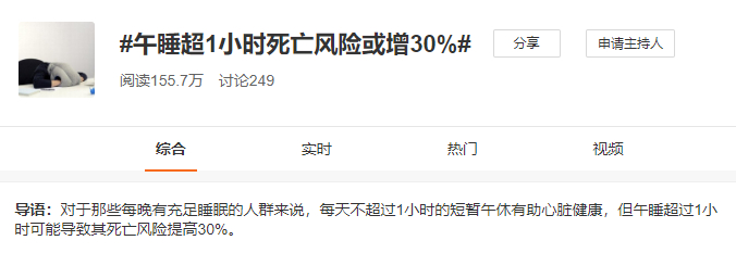 2020年欧洲心脏病学学会公布的中国科学家的一项新研究成果指出,对于那些每晚有充足睡眠的人群来说,每天不超过1小时的短暂午休有助心脏健康,但午睡超过1小时可能导致其死亡风险提高30%。