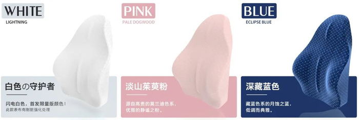 这款腰靠有3个颜色,白色、粉色、和藏青色,藏青色还有一个绑带款。
