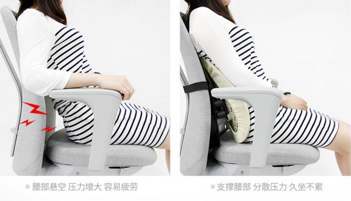 有关数据显示,使用双背垫护腰垫后,腰椎压力能从一般椅子的140%压力降到75%。